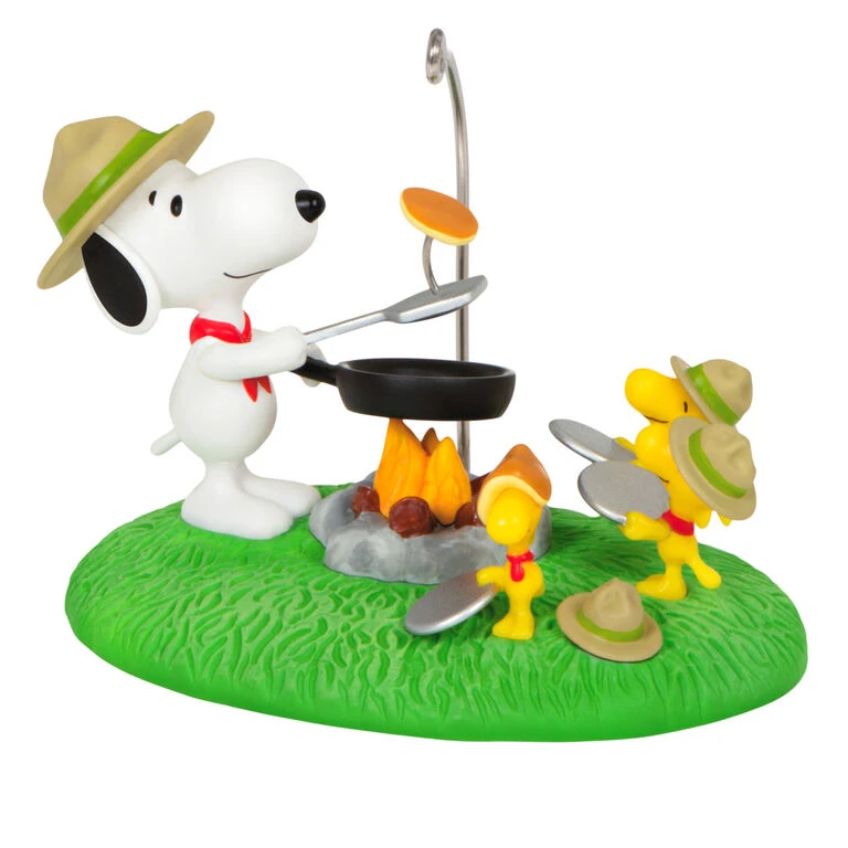 Scoutmaster Snoopy and his Beagle Scouts are up and at ’em, ready to fuel up for a fun day of camping with pancakes cooked over the fire. Celebrate the timeless tradition of scouting with this cute Peanuts Christmas tree ornament featuring Snoopy, Woodstock and their yellow feathered friends.