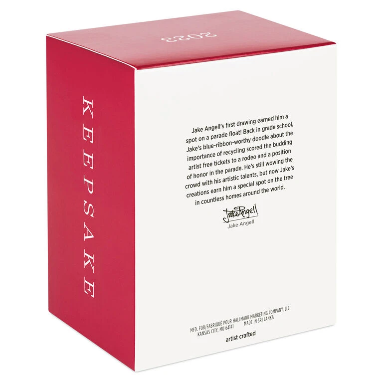 - Additional Details: Artist crafted by Jake Angell. Plastic Christmas tree ornament.